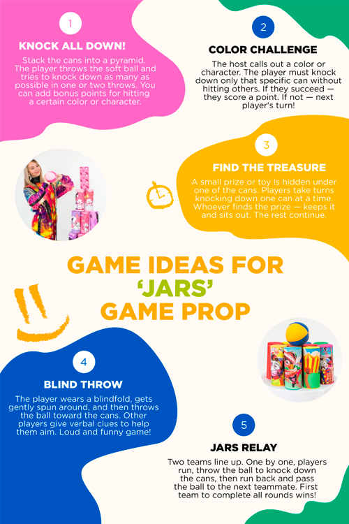 - Package content Game prop Jars Birch is an additional props for entertainers, perfect for children's parties and animation program. Bright and interesting game props will make it possible to develop unique scenarios for any event, emphasize the professionalism of the entertainers and keep the feeling of a holiday for a long time among the main characters of the event! There may be slight differences from the image, since each product is made individually! Package content: 10 jars, 1 ball
