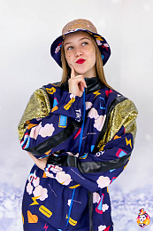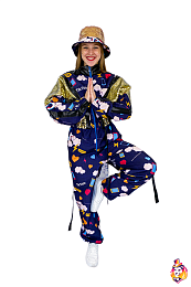 - Package content Gabardine jumpsuit with full color print and sequin inserts, panama hat in the color of the jumpsuit.