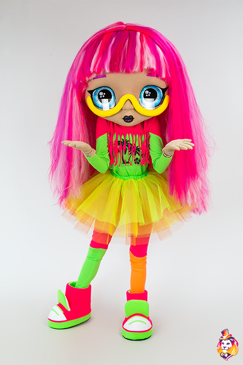 - Package content Doll Neon Mascot Costume is a memorable character who will delight the public at events and promotions. Our mascots attract attention from afar, people always want to take pictures with them and share photos with friends. Animators, advertising agencies and other companies choose our mascots for convenience in work and high-quality of costumes. On our production Carnival Mascot it is convenient to order and buy any mascot costume, all the ideas of the customer will be fulfilled. We produce branded mascots in branded colors with a logo and symbols. At the request of the customer, we can add animatronics - the mascot will be as alive and will be able, for example, to wink and open its mouth. Our products are made of modern eco friendly materials, durable and convenient to use. There may be slight differences from the image, since each product is made individually! Package contents: Head - 3D mask on a foam rubber frame, covered with fleece, mesh eyes, viewing area in the eyes, kanekalon hair. Body - turtleneck, tulle skirt, leggings. A pair of gloves, a pair of shoes (foam rubber frame, covered with fabric, on a polyurethane sole).