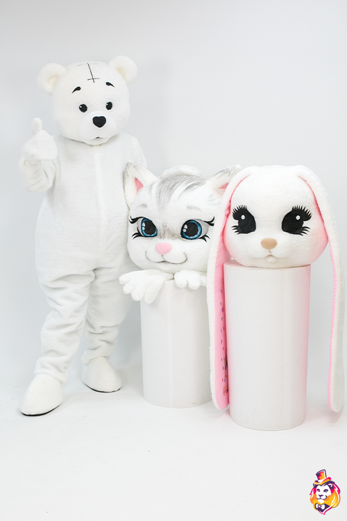 - Package content Three super mascots white Mascot Costume is a memorable character who will delight the public at events and promotions. Our mascots attract attention from afar, people always want to take pictures with them and share photos with friends. Animators, advertising agencies and other companies choose our mascots for convenience in work and high-quality of costumes. On our production Carnival Mascot it is convenient to order and buy any mascot costume, all the ideas of the customer will be fulfilled. We produce branded mascots in branded colors with a logo and symbols. At the request of the customer, we can add animatronics - the mascot will be as alive and will be able, for example, to wink and open its mouth. Our products are made of modern eco friendly materials, durable and convenient to use. There may be slight differences from the image, since each product is made individually! Package contents: Three heads (Bear, Bunny, Cat) - foam rubber frame covered with fur, mesh eyes, viewing area in the eyes, no additional ventilation holes. One body is a voluminous vest, a fur jumpsuit, a pair of gloves, a pair of mittens, a pair of shoes (foam rubber frame, covered with fabric, with polyurethane soles).