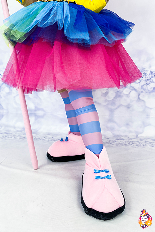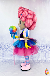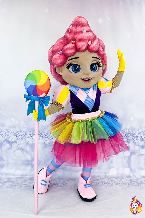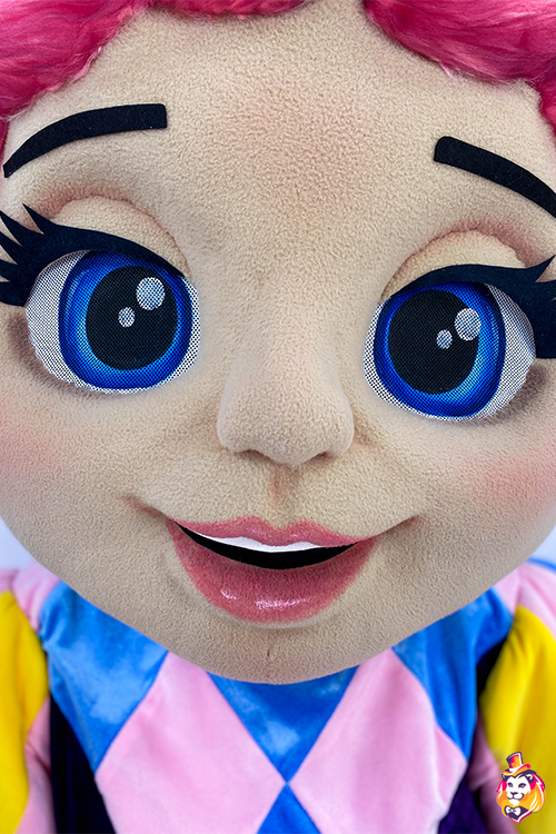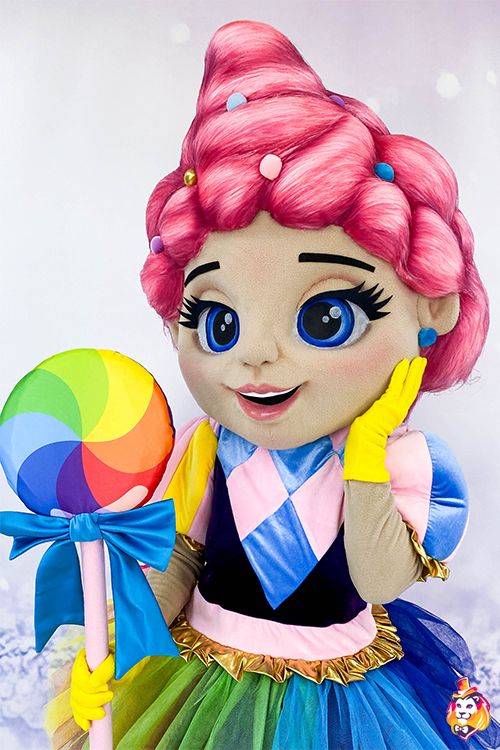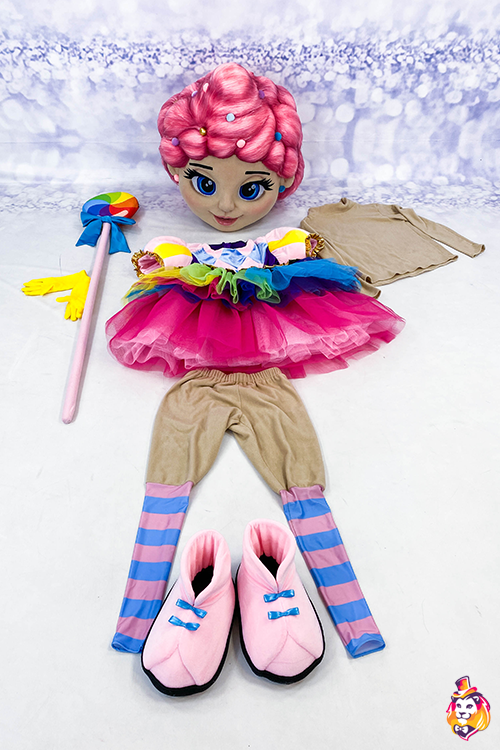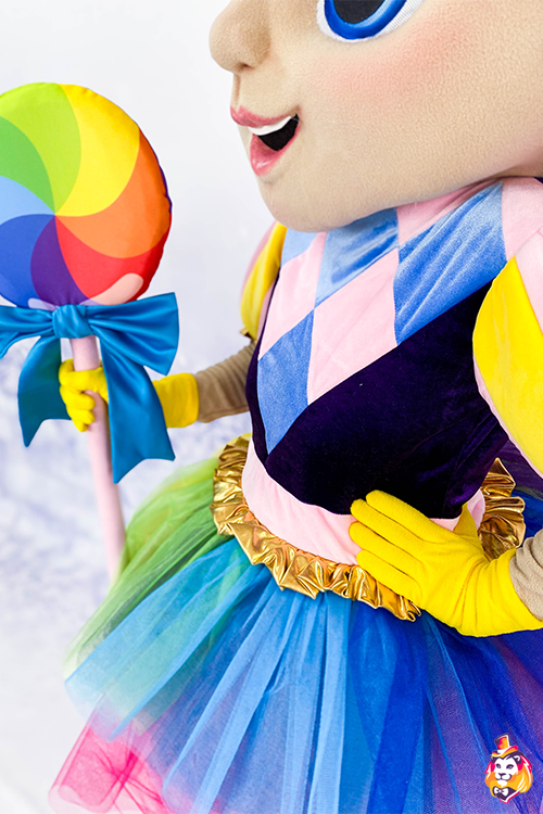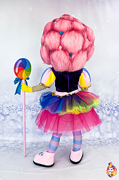 - Package content Head - foam frame, covered with fleece, mesh eyes, viewing area in the eyes, extra. no ventilation holes, imitation hair (foam frame covered with fabric). Body - dress, turtleneck and animator's pants made of fleece, a pair of gloves, a pair of shoes (foam rubber frame, covered with fabric, with a polyurethane sole), a lollipop staff.